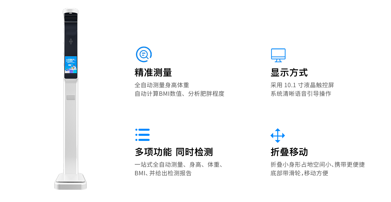 具备可折叠设计,支持身高体重测量、超声波测量,实现一体化测量。秒级速度、适用于批量体检,操作轻便便捷,轻松快速换场测量。