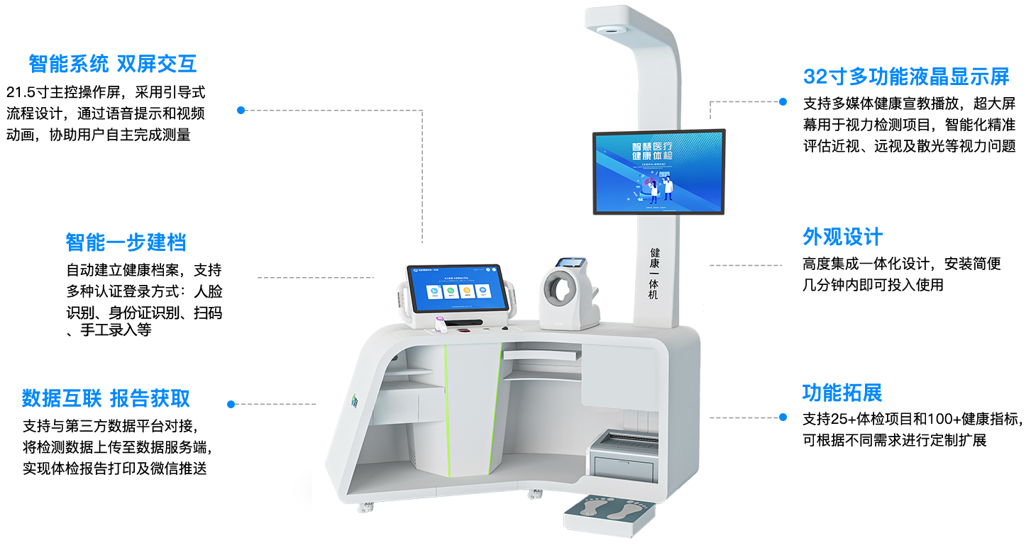 采用双屏幕设计,集成自助体检功能,满足基本公共卫生体检需求。主控屏与宣教屏独立操作,互不干扰,确保流畅体验。提供全程语音引导,实时测量并同步上传数据,可拓展远程诊疗,电子建档,居民体检过程简单高效,轻松完成。